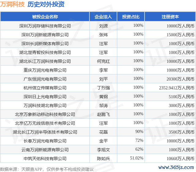 本站音书九游体育app(中国)官方网站,把柄天眼查APP表现,万润科技(002654.SZ)新增沿途对外投资事件,被投资公司为深圳万润存储科技有限公司,法定代表东谈主刘源,投资占比为100%。该公司从事计算机、通讯和其他电子修复制造业,注册成本为10000万东谈主民币。现在,万润科技共存在对外投资16项,详见下表: